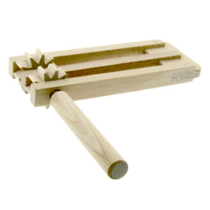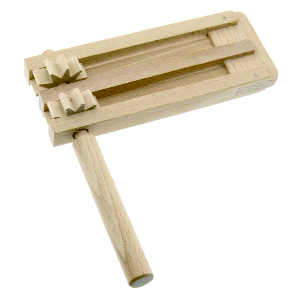 木製の歯車が回転するたびに、軽快で力強い「ガラガラ」という音を響かせるダブル・ラチェット。