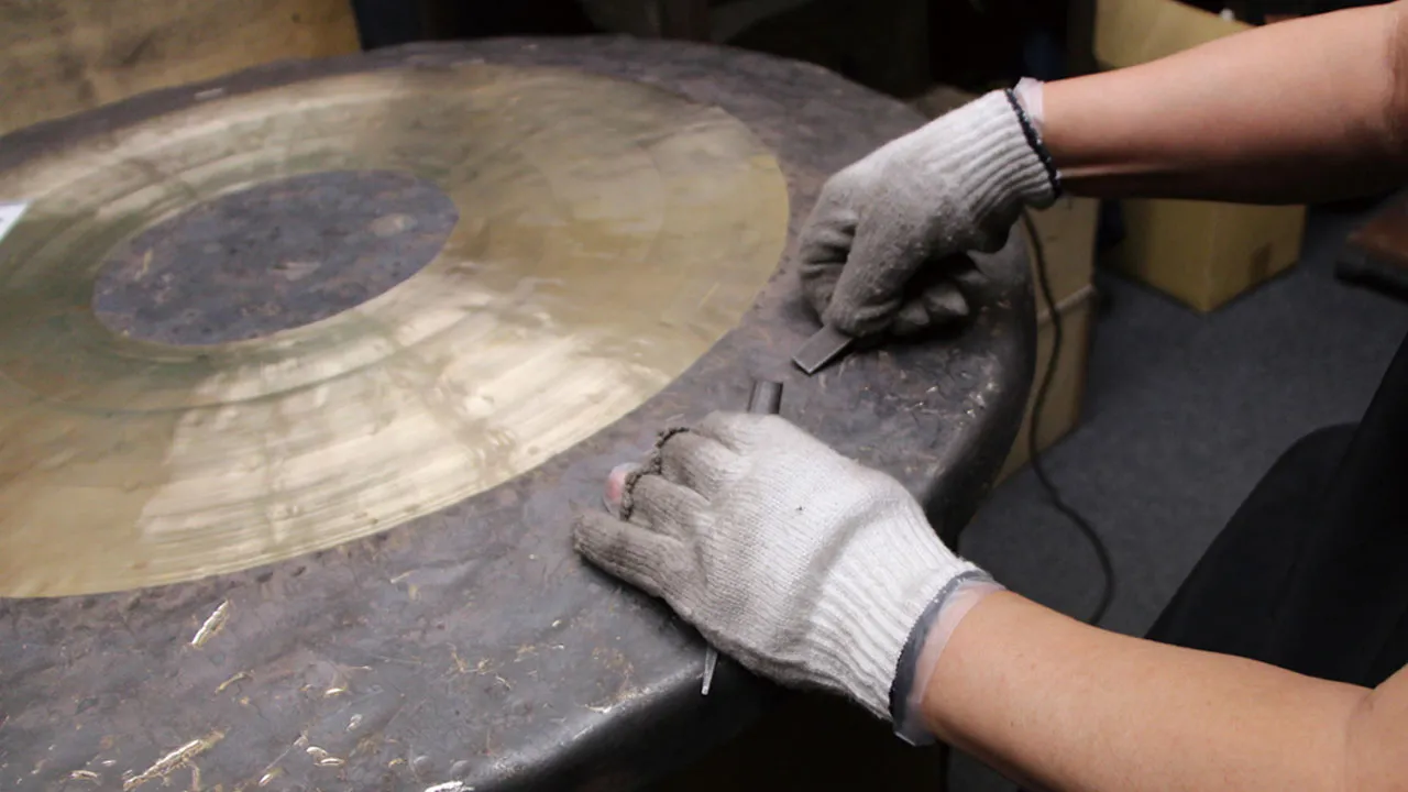 端を折り曲げた黒い縁の銅鑼(タムタム)の壮厳な響きとは対照的に、高音成分がすばやく立ち上がり、明るく華やかに響きます。