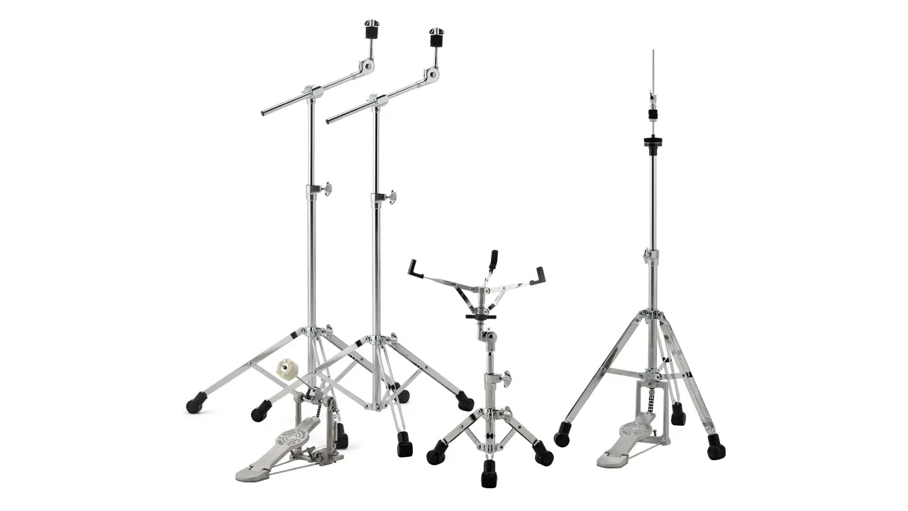 2つのシンバルスタンド、スネアスタンド、ハイハットスタンド、シングルペダルを含む、頑丈で機能的な1000 シリーズハードウェアのセットが含まれます。