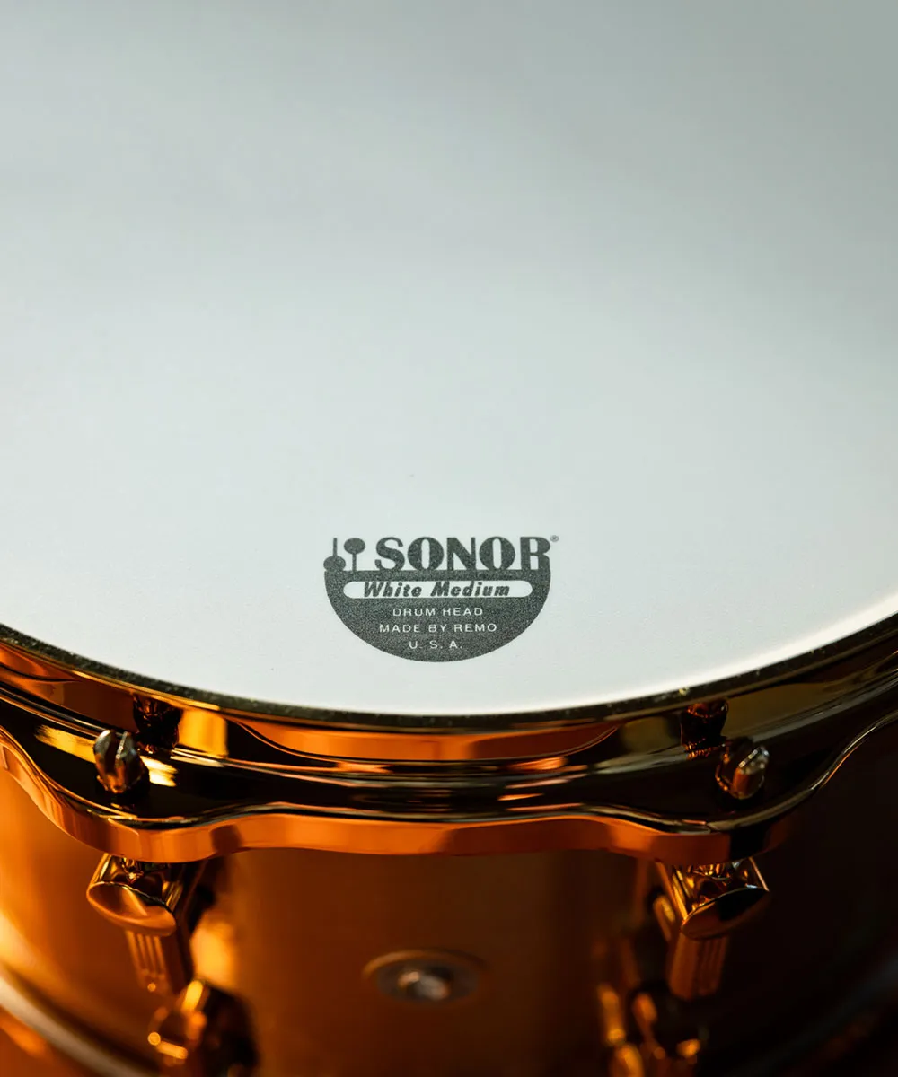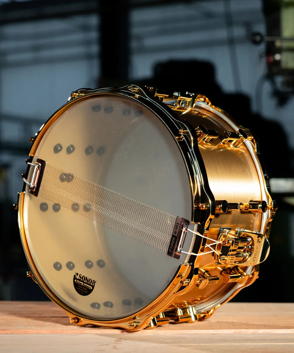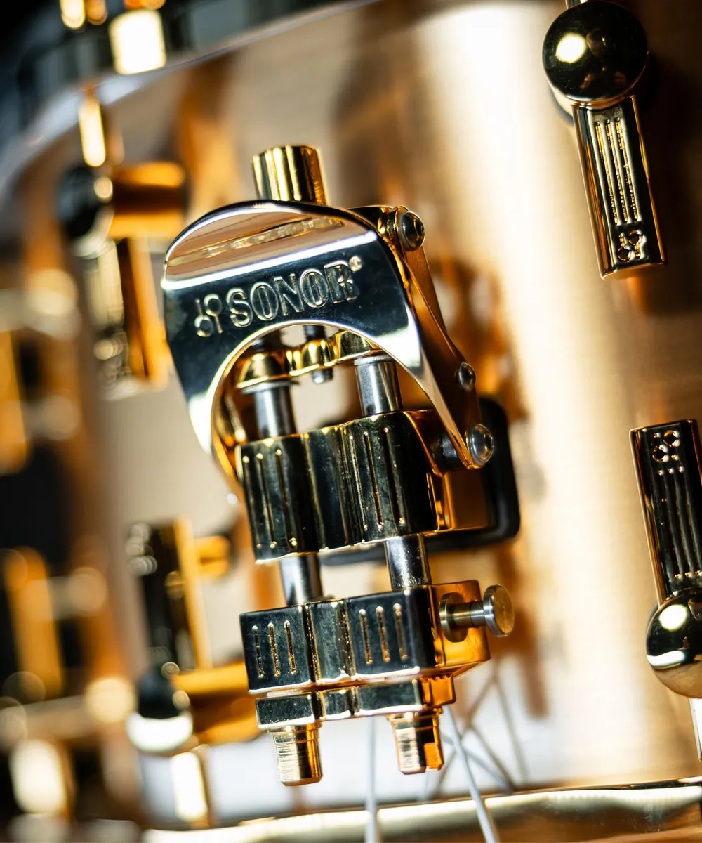 当時、SONOR が採用したどの素材よりも重量と剛性に優れていたのが キャストブロンズ でした。そのため、HLD 590 は比類なき 純粋さ・共鳴・プロジェクション(音の投射力) を実現しました。さらに、ブロンズシェルのゴールドに輝く外観と、コパーメッキが施されたハードウェア が組み合わさることで、当時の SONOR スネアドラムの中で 究極のラグジュアリーモデル となり、現在に至るまで 最もコレクターズ価値の高い一品 のひとつとして評価され続けています。